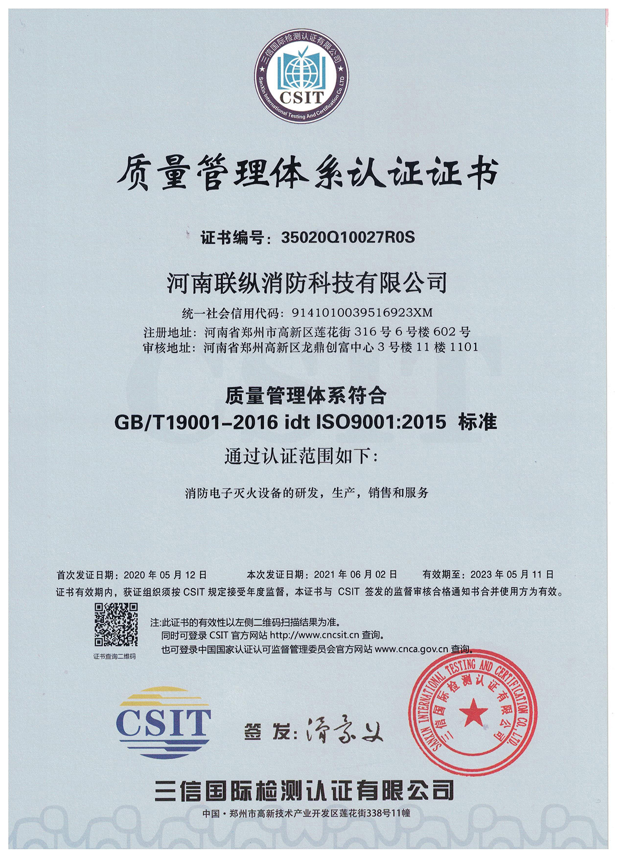 聯(lián)縱消防 ISO9001質(zhì)量管理體系認(rèn)證證書(shū)