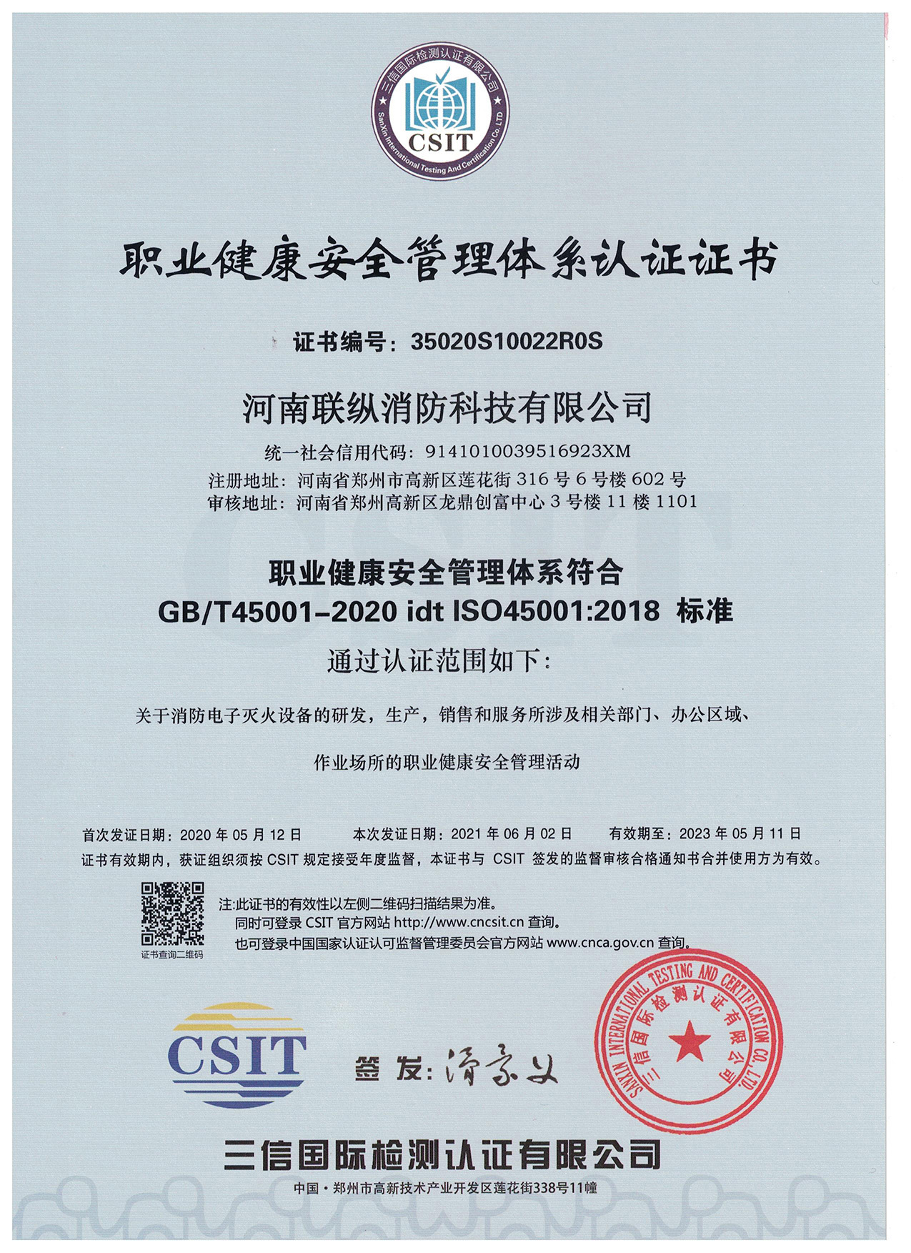 聯(lián)縱消防 ISO45001職業(yè)健康安全管理體系認(rèn)證證書(shū)