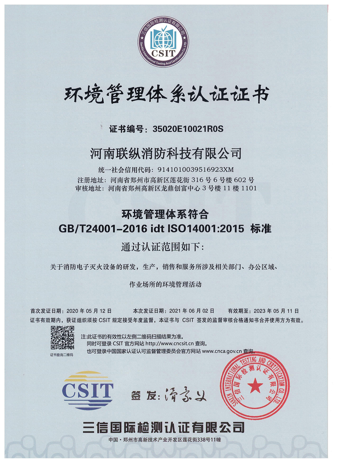 聯(lián)縱消防 ISO14001環(huán)境管理體系認(rèn)證證書(shū)